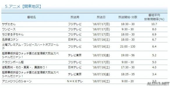 本周收视率:《海贼王》第二名(8.0%),《龙珠:超》第七名(5.0%)