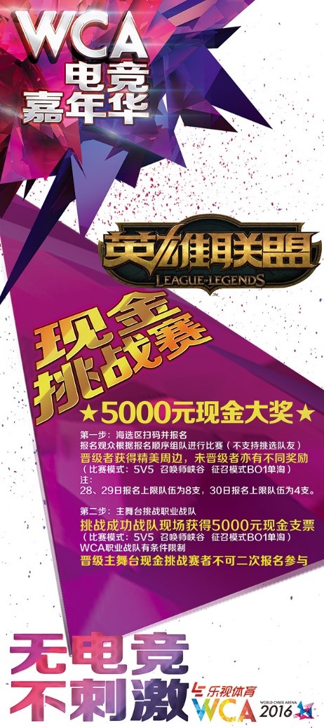 当然,如果未能及时报名《英雄联盟》现金挑战赛,WCA ChinaJoy2016展台同样有其他丰富多彩的水友挑战赛及体验区,海量WCA周边礼品,还有神秘精美大奖等你来拿!