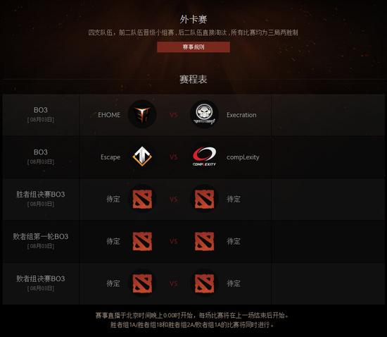 V社于8月3日公布了外卡赛的分组情况,四支外卡赛队伍分别为中国区的EHOME战队,美洲区的CompLexity战队, 欧洲区的Escape战队和东南亚区Execration战队。四支队伍将于北京时间8月3日凌晨进行三局两胜的双败淘汰赛,前两名的队伍将晋级小组赛。EHOME将于凌晨00:00点迎战东南亚区的Execration战队,打响2016国际邀请赛的第一枪。