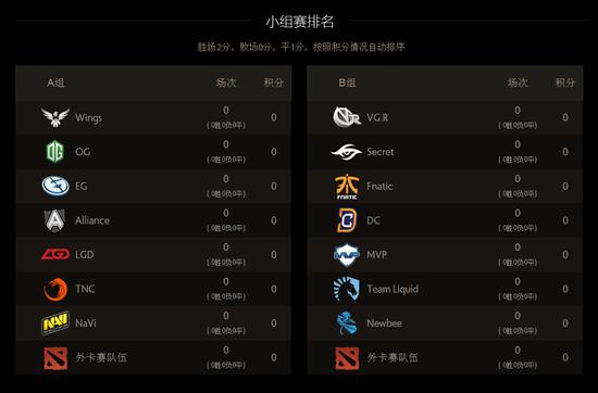 A组:OG、Alliance、Wings(中国)、NaVi、EG、LGD(中国)、TNC、外卡2