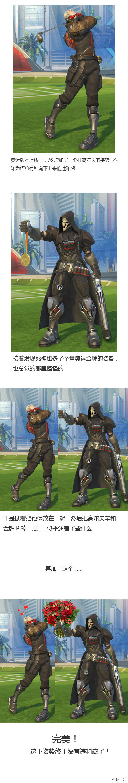 守望先锋上架了一大堆奥运主题的皮肤、姿势、特效、喷漆和语音,漫画家林无知[微博]脑洞大开,对士兵:76和死神的姿势小小的修改了一下,瞬间少女心爆棚,CP党们高呼发的一手好糖!