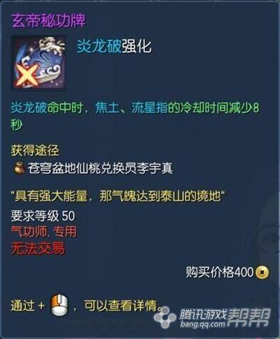 至于秘功牌,流星指3000%和冰河掌命中后重置双龙破CD都是可以选择使用的,我个人倾向于前者,前者适合于所有火系气功,后者适合于疯狗龙气功,至于另外2个是给冰系的,不过都会断加速,提升是有的,主要体现在单人方面,平常也不大。