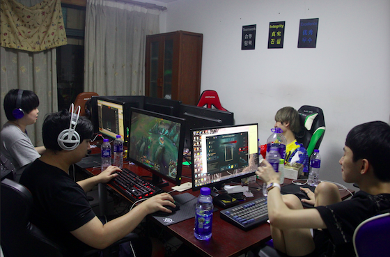 7月初的上海进入了梅雨季节,在宝山区一个小区的顶层记者来到了NB.Y(QG,原QG战队已经更改为NEWBEE战队,而现NB.Y卖给了原QG老板,原本应该叫QG,但因为夏季赛错过了注册时间,故沿用NEWBEE.Y的战队名。)战队的基地。推开门几台电脑背靠背紧凑的摆放在一起,面前这不到30平米的空间就是NBY的训练室,训练室的旁边就是厨房,几乎没有什么落脚的地方。