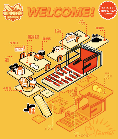 JOO给这一季的Openday绘制了海报——过去是JOO总,现在是JOO总,永远是JOO总——海报上是虹桥天地演艺中心、LPL2016比赛赛场的二次元呈现风格。今年的LPL现场因此在设计中被重构,并因此也永远留存在“P社设计”之中。