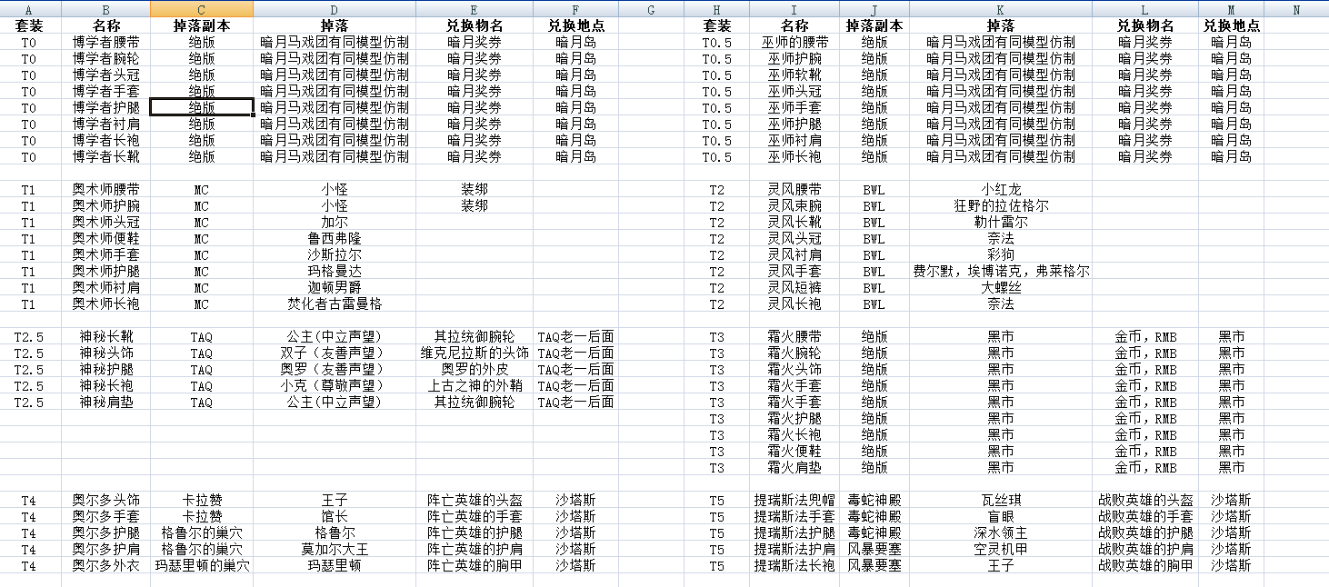1个多小时 只做了大号法师的……从T0到T18 所有的套装出处。兑换位置……等等都有……
