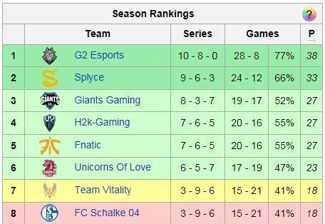 施行胜利加3积分无胜负加1积分的欧洲LCS常规赛,G2和Splyce分别以38积分和33积分位列1、2,直接进入4强。Giants和UOL、FNC和H2K均进入8强。