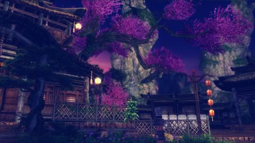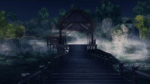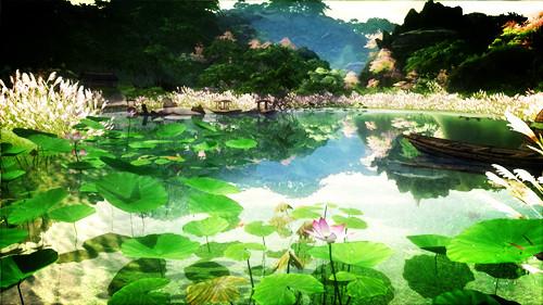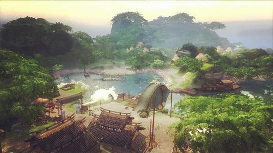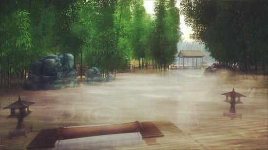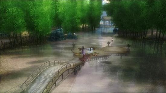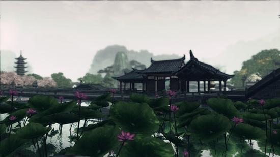 素雅的水墨画,烟波缭绕,九曲长廊亭台水榭碧叶荷花相互映衬。PS:图一所示的桥是可以卡bug上去的,进地图往右上走,到了空气墙背对空气墙和另一个角色抱抱,然后推开,就能上去了,然后往外走跳下去就到亭子了,就是第二张图最左边有个草垛那个地方差不多。