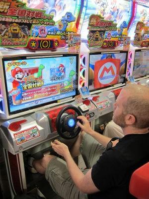 街机里的马里奥卡丁车。日本仍然到处都有街机游戏厅,并且里面的游戏机种类琳琅满目。尤其是在东京的宅男圣地秋叶原,这里有Taito Hey——一个街机聚集地,经常会有新出的街机游戏在这里测试,同时也是一个玩经典射击类游戏的好地方。这里不仅仅是一个玩游戏的好地方,也是一个看游戏的胜地,因为这里随处隐藏着民间高手。