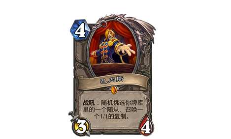 对应低费功能卡。这张卡对应的是低费功能卡,在每一个冒险中我们都能多多少少的看到这类低费的功能卡的存在。例如探险者协会的铜须,naxx的领主。这张卡也是明显的功能卡,因为4点的费用配上身材,如果召唤一个11的白板明显是亏的,但只要随从不是战吼和白板,即可触发效果,所以适用面非常的广。这里抛砖引玉:在卡组中只带异能强的随从时,例如蓝龙王,大螺丝,加基森,佛丁,只要成功召唤,就非常的强力,非常适合作为套路卡组的启动引擎。这张牌的上线极高,下限也不低,是明显的实用卡。