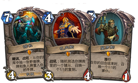 第四张:馆长。这是一张多功能卡。它的作用在于抽卡+站场。这张卡看上去就非常的实用,首先它7费,就能稳定的过3张牌。虽然对抽的牌有限制,但既是它的缺点,又是它的优点,对抽牌性质的限制,却变成了变相的检索。可以对抽的卡加以预测。身材可以对比熊德的546,相当于用2点费用抽了3张卡,它本身还具有机械属性,可以切合一些机械卡组。 而野兽、鱼人和龙牌中又有相当多的卡是功能卡,所以实用度非常高。 我对这张卡的理解是,这是一张多功能卡。可以适用于很多的控制套牌中。它的缺点在于费用偏高,偏笨拙,会加快疲劳速度,且会增加构筑负担,使你在带上它后不得不再加上龙鱼和野兽,减少了构筑时其他卡的空间,但是综合来说,利还是大于弊,属于实用橙卡之一。