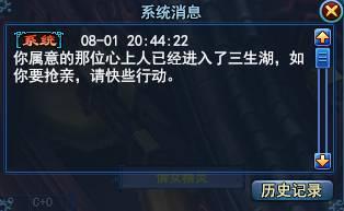 当你的意中人与他人步入三生湖时,你会收到消息。若你决意抢亲,请果断地使用抢亲帖进入三生湖。