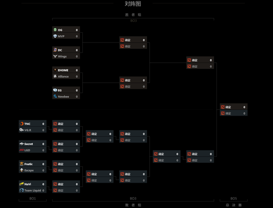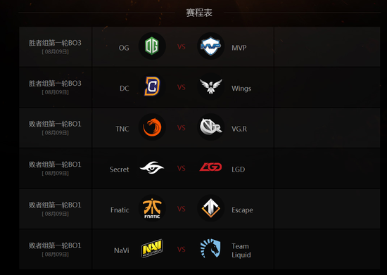 目前A组、B组的胜者组出线情况已经确定。A组的OG、EG、Alliance、Wings战队锁定了胜者组的位置,而TNC、NaVi、LGD以及Escape战队则憾居败者组。