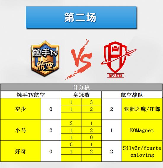 第一场: 空少毒胖PK亚洲之鹰屌丝三枪套,开局yzzy决策性失误, 2分10秒右路被巨人+小皮卡击破,调整心态后yzzy利用 矿工+小苍蝇拿下空少左路,进入加时赛后在己方右路残 血的情况下果断中出三枪对拼,最后以55血量的优势优先 胜出。yzy帅气二连胜,拿下航空战队本轮首场胜利!