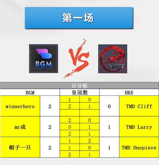 第一场: 双方毒胖内战,Cliff强势进攻1分18秒破winnerhero 右塔,双发左塔血量岌岌可危,双倍时间双方毒胖各攻 一路,Cliff进攻被完美防守,己方右塔被破,最后残血 小皮卡必杀一刀,winnerhero二连胜提前结束了游戏。