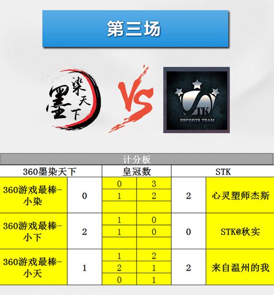 第三场: 来自温州的我用屌丝三枪来对付小天的毒胖套,开局来自 温州的我分路三枪进攻打出优势,利用矿工+火枪在28秒 攻破小天右路,最终来自温州的我一战定音为STK带来了 本场的胜利!