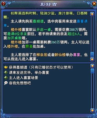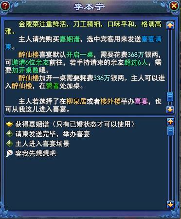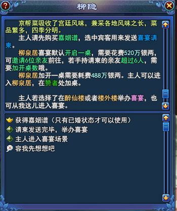 已婚的玩家可以到北京的柳隐、金陵的李本宁、杭州的彭好古处,分别进入北京柳泉居、金陵醉仙楼和杭州楼外楼举办喜宴。