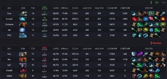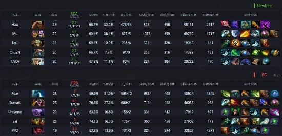 对线期虽然NEWBEE取得了一些人头优势但经济一直处于落后。14分钟NEWBEW推上路外塔,EG选择换中,NEWBEE破上后迅速回中防守,在大鱼成功的先手下,NEWBEE成功打出一波0换4。但在2分钟后,EG成功通过开雾绕后还了NEWBEE一波团灭。18分钟,蓝猫血精配合队友击杀NEWBEE三人,进入节奏,并在21分钟再次无损团灭NEWBEE五人。NEWBEE全面崩盘,23分钟远古处再次被EG团灭。此后EG压迫推塔,在蓝猫的无限超神中,NEWBEE在30分钟无奈打出GG。