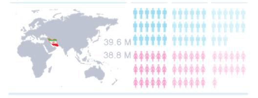 据国家公民登记组织的数据中获知,伊朗伊斯兰共和国的人口:约78,475,78人,平均年增长率为1.29%。其中,女性人口为3880万,男性人口为3960万。0-19岁人口占人口总量的32.16%,约为2520万;20-44岁人口占人口总量的46.02%,约为3610万;45岁及以上人口占人口总量的21.82%,约为1710万。