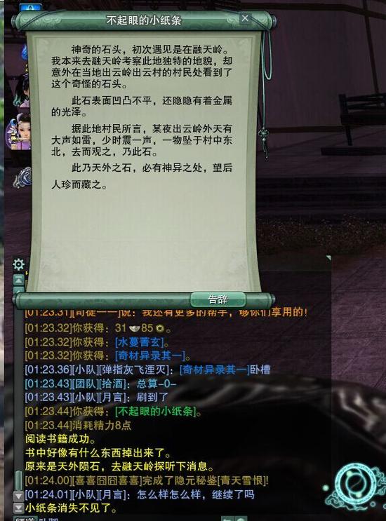 念齐一套《奇才异录》,背包里出现一张[不起眼的小纸条],小纸条指引去下一个任务点融天岭出云村。