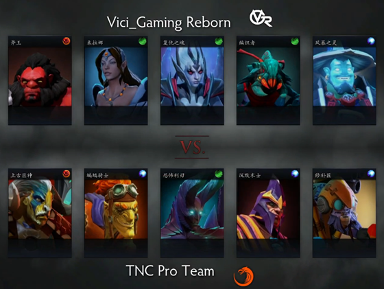 VGR小组赛表现不佳,本场比赛在位置上做出调整,教练操刀中单蓝猫,NONO拿了个打野斧王,前中期VGR也收到了一些成效,不过TNC的TB无解肥,经济始终全场第一,后来的几波关键团,VGR没人能限制TB的发挥,TB输出爆炸,TNC逐渐开始掌握住场上的局势。之后TNC破掉两路高地,VGR的核心买活死,无奈之下只能打出GG。
