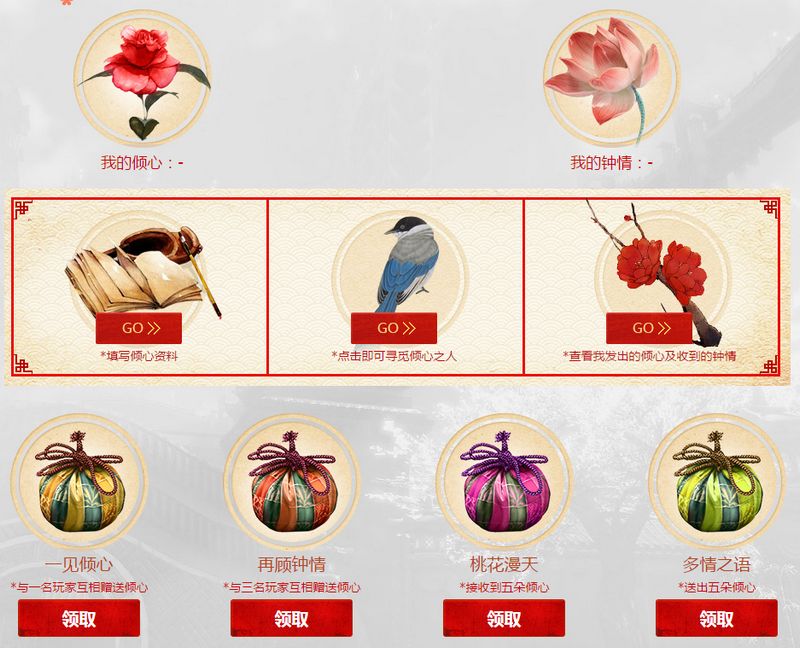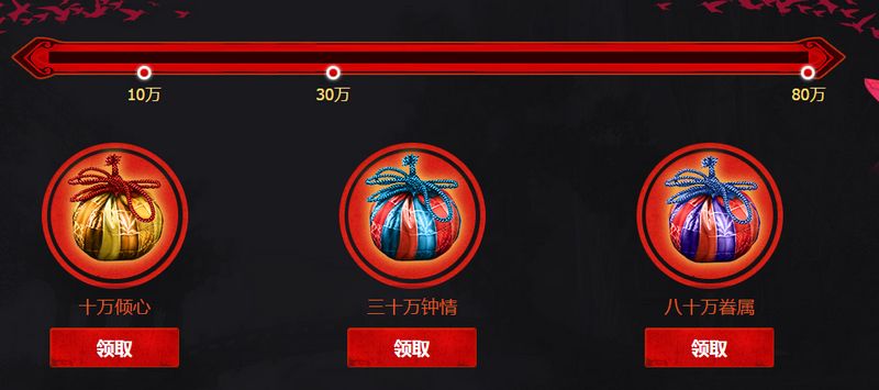 活动期间全区全服每有玩家收到一次倾心,即可累积一点爱意值,当爱意值分别达到10万、30万、80万时,所有参与过“2。倾心之语”的玩家即可领取一次对应的礼包
