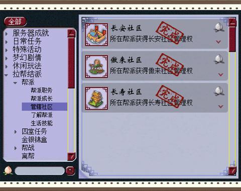 第三部分是管辖社区,这个部分的成就点共有3点,帮派要获得社区的管辖权限,是需要帮派之间相互竞投的,竞投时间为7天,第7天晚上20:00截止,系统会挑选出竞投价格最高的4个帮派共同负责管辖社区,帮派只需要分别成功竞投这三个社区的管辖权限就能完成这里的所有成就。