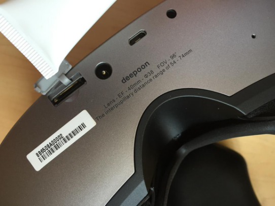 一体机的底部接口区域从左至右分别是TF卡槽、2A电源接口、Micro USB、AUX3.5 音频输出口,在各个接口部分并没有标示名称。不过在下方印刷了光学参数(40mm焦距、38mm外径,FOV视场角为96度,自适应的瞳距范围54-74mm)。