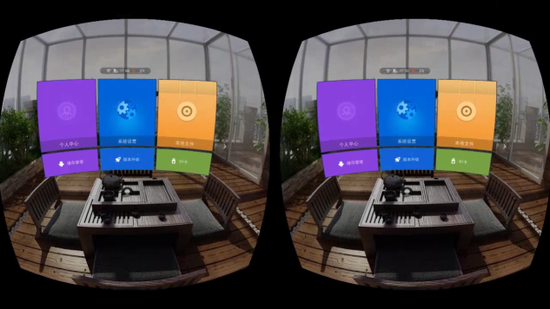 第一页是个人中心、系统设置、本地文化呢、缓存管理、版本升级、SD卡选项,点击进入可以进行相关设置。界面比较人性化的地方是,在UI的下方有个人带着VR眼镜的小头像,将准心瞄准后点击,可以随意移动UI的位置、倾斜度等等。一般VR设备启动后会根据启动时的朝向自动配置UI的方位,所以有可能出现人要去适应这个操作界面的方位而调整位置,不过有了这个设置之后,人就不需要转动了,是个很方便的功能。