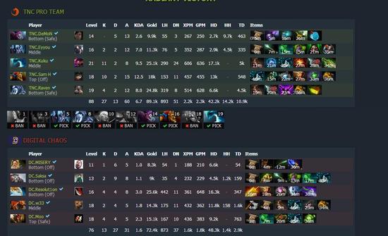 ,节奏完美 16分钟,虽然DC小娜迦仍然保持无解肥做出辉耀,但TNC已经迎来了自己的强势期,全面压制DC,18分双方再次爆发团战,W33的龙骑经济不好秒躺,TNC轻松打出1换4;23分,TNC破掉DC所有外塔,顺势上高,DC团战无力,一触即溃,刚刚有起色的娜迦交出买活,勉强守下一波,随后DC虽然主动开雾出来拿到击杀,但都是酱油的人头,并不能起到决定性的作用。
