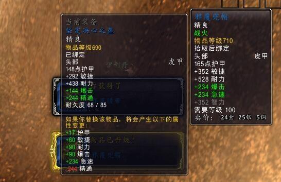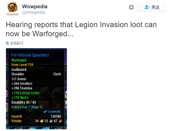 根据玩家的报告,邪能套装散件基础装等为700,有一定概率开出战火,提升5个装等,最高为720装等。