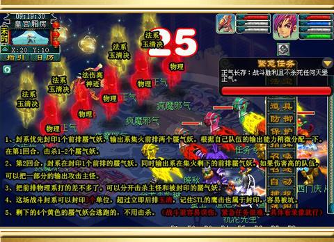 帅编这里选择的是分支一的任务,在3X难度上这里的紧急任务是战斗胜利且不杀死后排的天罡正气。这场战斗封系先控制后排的法系,因为后排的法系法伤还是挺疼的,如果队伍佩戴罗汉就更好了,然后输出集中点杀前排的邪气,前排的邪气怪都是物理输出的门派,封系最后可以封印3个单位,否则怪就会玉清,杀完前排的邪气怪之后,后排的正气怪就会逃跑了。
