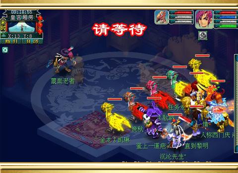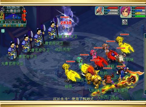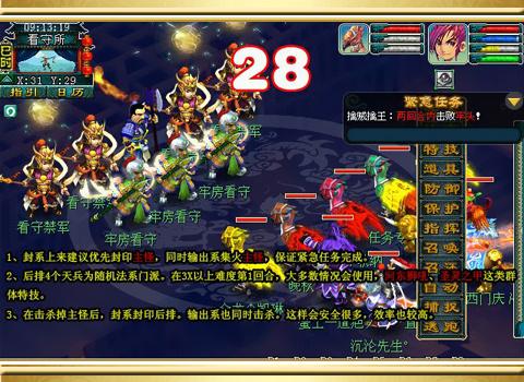 逃出大唐官府后,在长安城皇宫厢房门口碰到禁军守卫对话,然后进入厢房与举荐大臣对话。被压进大牢当中,与大牢守卫战斗。在3X难度以上这里的紧急任务是两回合内击杀掉主怪,主怪血不多,全部集火他,紧急任务是很容易完成的。这场战斗的后排是随机的法系门派,所以击杀主之后,建议先把后排的几个依次清理掉。