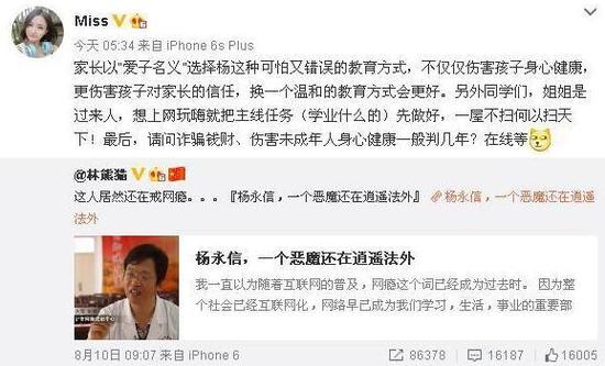 大家所熟知的电竞女主播第一人Miss也在第一时间站出来表态,支持林熊猫。Miss调侃道:“请问诈骗钱财、伤害未成年人身心健康一般判几年?在线等”。