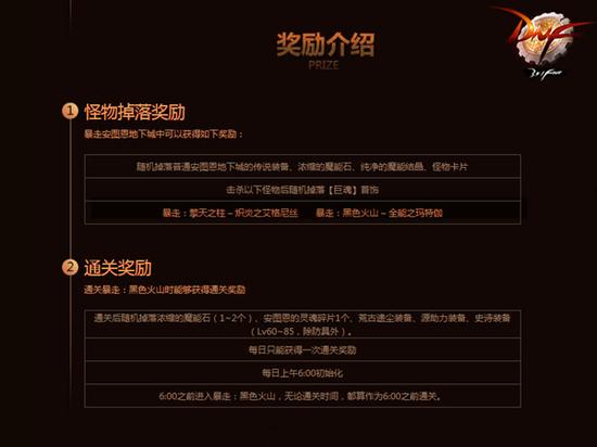 安图恩觉醒地下城固然难度较大,但通关后的奖励也相应的非常丰厚。安图恩觉醒地下城随机掉落普通安图恩地下城的传说级装备、魔 能石、纯净的魔能结晶、怪物卡片。同时,觉醒:擎天之柱会掉落炽炎之艾格尼丝巨魂首饰,觉醒:黑色火山会掉落全能之玛特伽巨魂首饰。通关觉醒:黑色火山时 可以获得最终奖励,包含了浓缩的魔能石1~2个,安徒恩的灵魂碎片1个,荒古遗尘、源助力、60~85级史诗装备中的1种。需要注意的是,通关安图恩觉醒 地下城每天只可领取一次奖励,为了丰厚的奖励,勇士们需要每天牢记推倒安图恩的日常,将阿拉德彻底从安图恩的魔掌中解放出来。