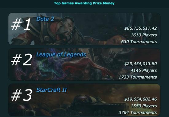 在TI6之后,在esportsearing的赛事奖金榜上,《DOTA2》也继续以累计8676万美元的总金额继续拉开了与其他游戏之间的差距,排在第二的《英雄联盟》各项赛事总奖金迄今累计为2945万美元,排在第三位的《星际争霸2》累计则为1965万美元。