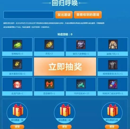 回归呼唤!邀请注册过剑灵,在2016年8月1日之后QQ号下所有角色未登录过游戏的玩家参与活动,并成功领取回归再战礼包后即算作成功邀请;可根据邀请成功的数量领取以下礼包;每成功邀请一位还可以获得一次抽奖机会;