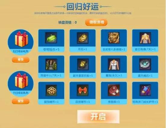 回归好礼!回归玩家每天登陆之后即可获得一次转动好运转盘的机会,累积开启转盘达到5、10次还可获得额外礼包。