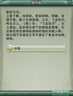 如果你在清理背包的时候不小心把卦象弄丢了,不要急,到敬师堂回稻香村,找到余半仙,你依旧能接到一个算卦的任务,但因为你已经算过了,所以点击领取之后会发现又一个抄录的选项,这时候点击抄录以后你会发现你的卦象已经安静的在你背包里了。