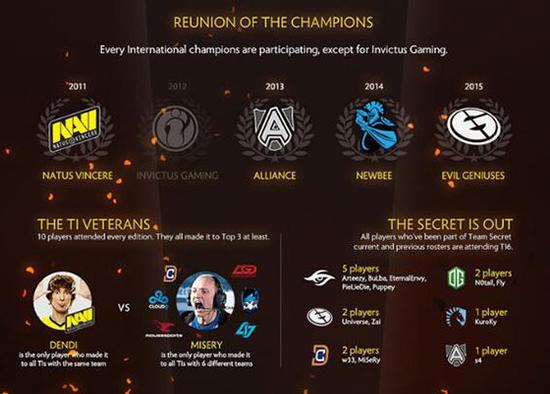 除了TI2冠军IG以外,另外4年的TI冠军都参加了本次TI主赛事。