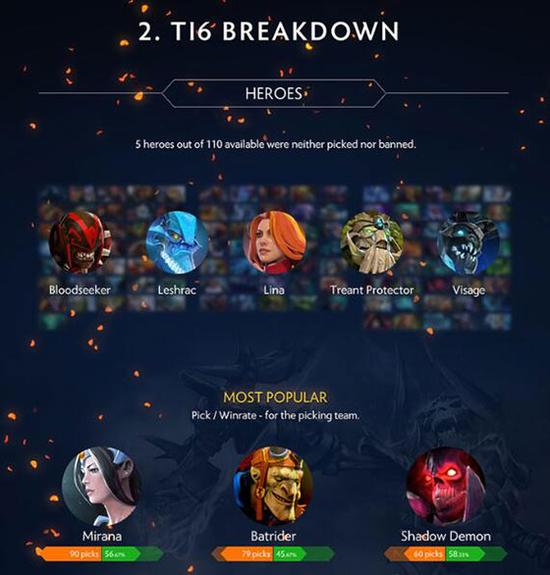 在TI6中被PICK次数最多的英雄有:白虎,90次登场,56.67%的胜率;蝙蝠,79次登场,45.67%的胜率;毒狗,50次登场,58.33%的胜率;蓝胖,58次登场,44.83%的胜率;大牛,60次登场,64.00%的胜率;伐木机,50次登场,52.00%的胜率;虚空,50次登场,50.00%的胜率。