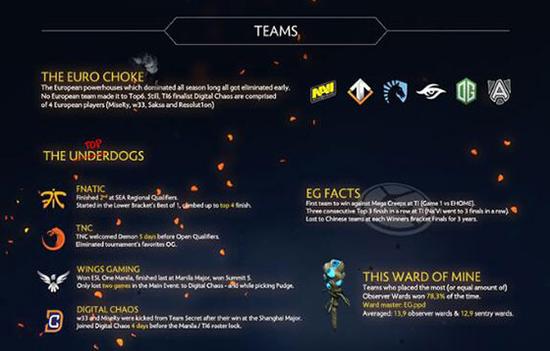 TI中的那些“黑马”:Fnatic在东南亚预选赛只排在第二名,最终从败者组第一轮的BO1开始,一路达到了第四名;TNC在大公开赛之前5天才找到队伍最后一名选手Demon,他们在败者组淘汰了夺冠大热门OG;Wings赢得了ESL ONE马尼拉,在马尼拉特锦赛中垫底,又赢得了TS5,在淘汰赛阶段,他们只输了两场,都是面对DC,都使用了屠夫;DC队中的Misery和w33在赢得上海特锦赛后,被Secret踢掉了,在TI人员名单锁定前4天才加入DC。