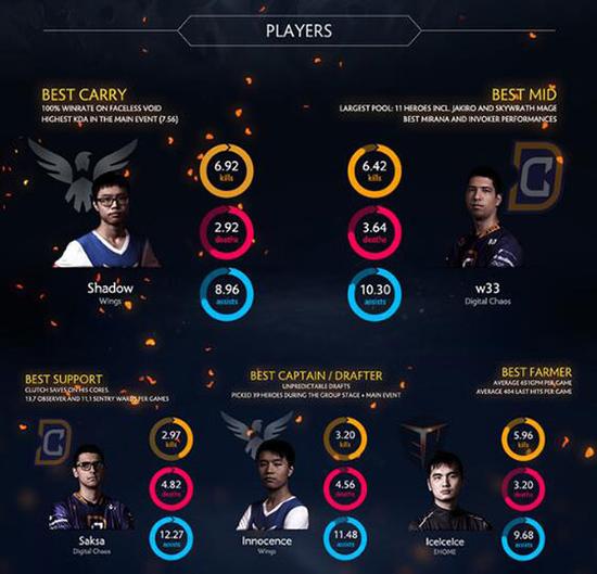 最佳队长Wings.y丶Innocence,所有队伍中最难以预测的BP,小组赛和主赛事中选择了39(应该是58,图中此处有误)个英雄,整个TI中场均击杀3.20次,死亡4.56次,助攻11.48次;
