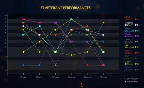 TI老选手的成绩走势图,大家直接看下边的折线图,这里说几个有代表的:Dendi和Puppey高开低走,一路下跌;Misery在TI1和TI6中成绩很好,在中间几届TI中成绩很糟;MMY是成绩最稳定的选手之一,在之前都成绩很好,不过今年雪崩;iceiceice也是成绩最稳定的选手之一,TI3在9到12名,其余都在前6名。