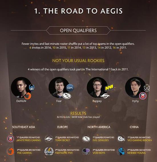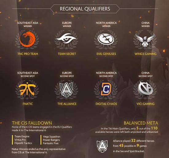 地区预选赛的优胜者有:东南亚区的TNC和Fnatic,欧洲区的Secret和Alliance,美洲区的EG和DC,中国区的Wings和VG.R。