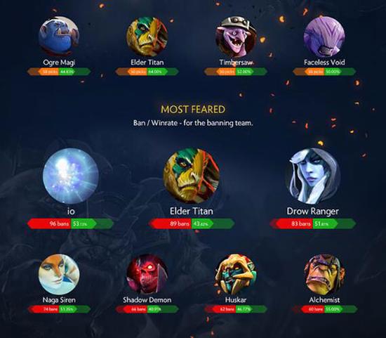 在TI6中被BAN次数最多的英雄有:小精灵,96次被BAN,53.13%的胜率(指的是一支BAN掉小精灵后,这支队伍的胜率);大牛,89次被BAN,43.82%的胜率;小黑,83次被BAN,51.81%的胜率;小娜迦,74次被BAN,51.35%的胜率;毒狗,66次被BAN,40.91%的胜率;哈斯卡,62次被BAN,46.77%的胜率;60次被BAN,55.00%的胜率。