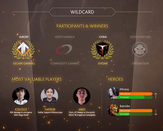 外卡赛共有4只队伍,包括EHOME、CoL、Escape和Execration,最终出线的是EHOME和Escape。