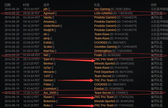 另外,我们在登记表上还看到,在TI6淘汰夺冠大热OG战队,取得不俗成绩的TnC目前有4名队员的信息显示为“离开队伍”,这其中就包括名气最大的Demon。这样的人员变动似乎也预示着这匹“黑马”到了频临解散的边缘。