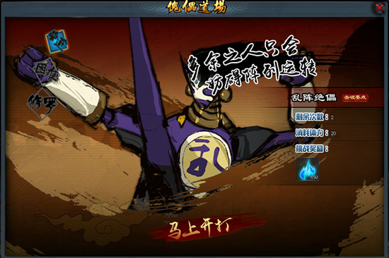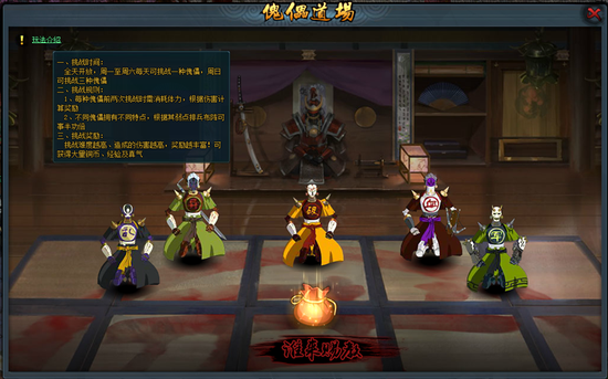 玩家可以挑战各种特殊类型的傀儡,通过特定的打法来战胜傀儡,根据对怪物伤害的多少计算获得的奖励的数值。获胜获得全部奖励,失败获得部分奖励,奖励有铜币、经验、真气