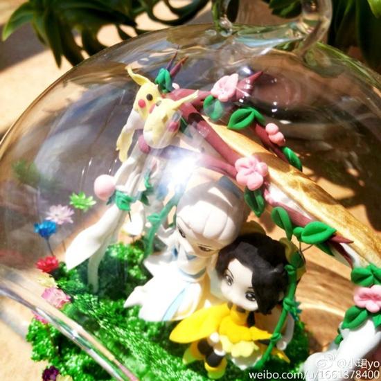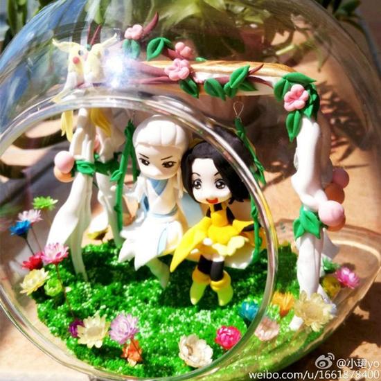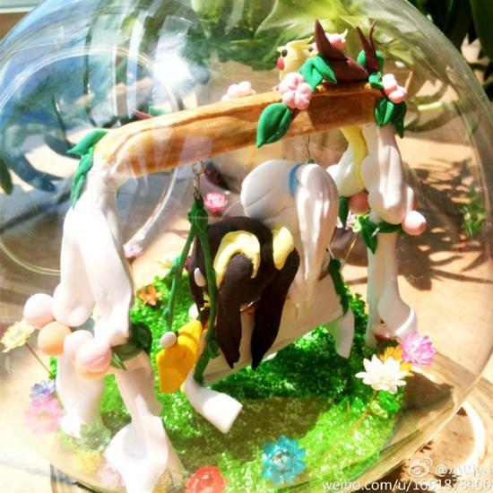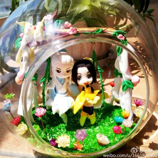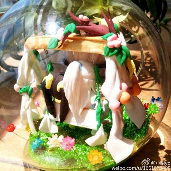 超爱的新挂件[锦帐重帘]双人秋千[可怜]剑三的小玩意越来越用心啦!用粘土还原了装在玻璃瓶里!超棒!这个还能动哦!