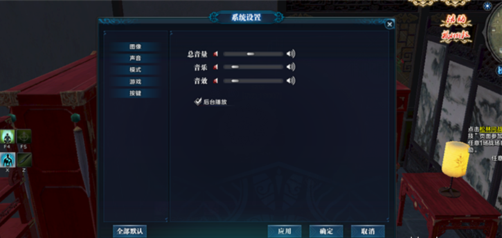 玩游戏会切出去游戏画面也不用担心听不到歌曲,在系统设置里面,可以设置后台播放,具体如下:点击右上角的齿轮按钮即系统设置(快捷键ESC)-声音-后台播放点击对勾最后确定即可。游戏挂机的时候,浏览我们客栈最新内容的时候也可以享受这些好听的歌曲哦。